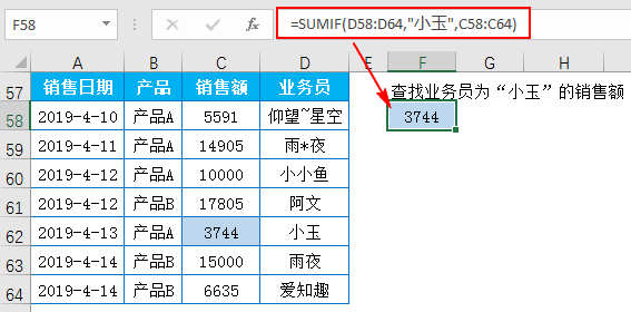 =SUMIF(D58:D64,”小玉”,C58:C64)