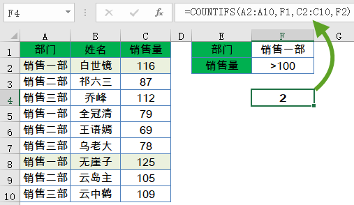 统计“A2:A10中的部门等于F1单元格指定的部门,并且C2:C10单元格区域中的销售量大于100”的个数,统计条件支持通配符。