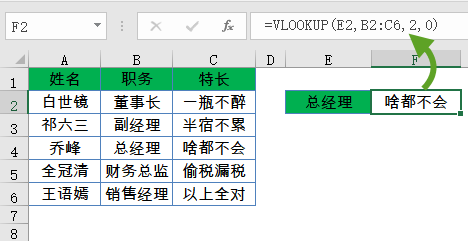 如下图,需要根据E2中的职务“总经理”,查询对应的特长,公式为: