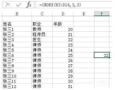 语法:= INDEX(要返回值的单元格区域或数组,所在行,所在列)