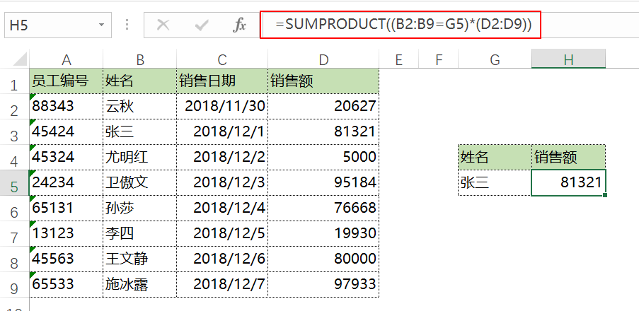 查找下面姓名对应的销售额。套路:=SUMPRODUCT((条件=条件区域)*(求和区域))