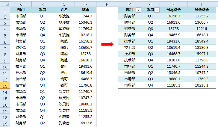 如下图所示,是一份某个单位的季度奖金,现在按要求,计算出每个部门的各个季度的最高奖金与最低奖金: