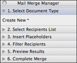 如何在Mac的Word 2011中创建邮件合并?使用Mac的Office 2011,在Word中合并邮件的指南是Mail Merge Manager。您可以通过从菜单栏中选择工具→邮件合并管理器来调用邮件合并管理器。它旨在从步骤1的顶部开始使用,然后逐步进行到步骤6。
