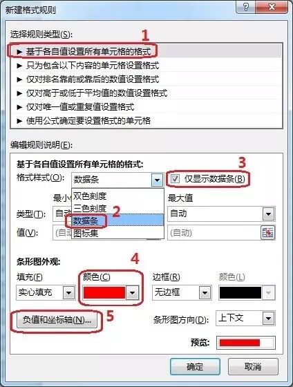 这时会弹出“新建格式规则”对话框,这里就我们一步步设置了:1)选择规则类型,选中第一项:基于各自值设置所有单元格的格式。2)格式样式,选择“数据条”。3)勾选格式样式后面方格:仅显示数据条。(PS.如果这里不勾选也没问题,只是最后显示时候把数据也显示出来而已。)4)设置条形图外观下面的颜色,随你喜欢啦。5)点击“负值和坐标轴”进入设置。