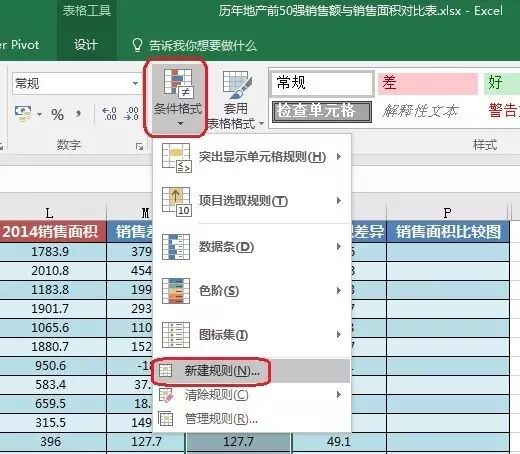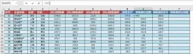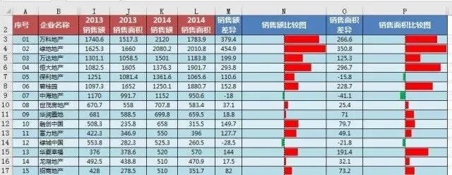 比表,房地产12强2013、2014年度销售额、销售面积数据,我们要做2年之间增减比较,直接拿2014年的数据减去2013年的数据即可(M列、O列数据)。话说要求次一点的领导,到这一步也就算了,毕竟人家能看得懂数据嘛。那要求高一点的呢,你再给他插入一张图表(柱形图)也是可以的。今天,小编教大家就用条件格式,不用插入图表照样直观。