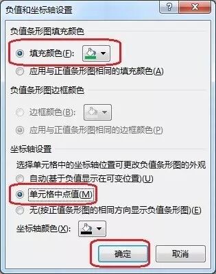 这时候又会弹出一个对话框,叫“负值和坐标轴设置”,先设置负值的填充颜色(也是随你喜欢啦~),然后在下方“坐标轴设置”处选中“单元格中点值”,确定退出回到刚才“新建格式规则”对话框,再确定退出~~~