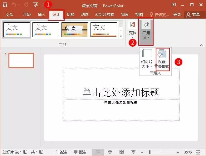 1、点击“设计”选项卡的“自定义”选项组,单击“设置背景格式”。