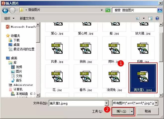 3、在“插入图片”对话框中,选中“满天星1”,再单击“插入”按钮。