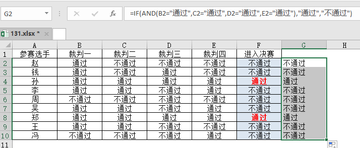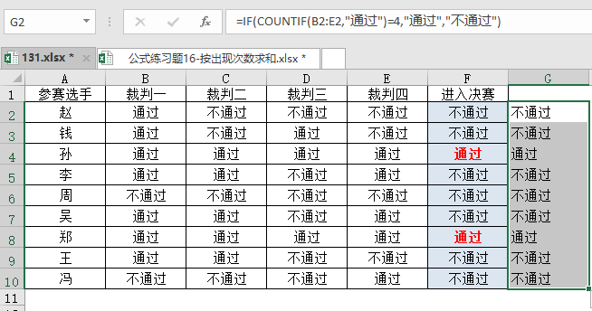 =IF(SUM(–(B2:E2=”通过”))=4,”通过”,”不通过”)