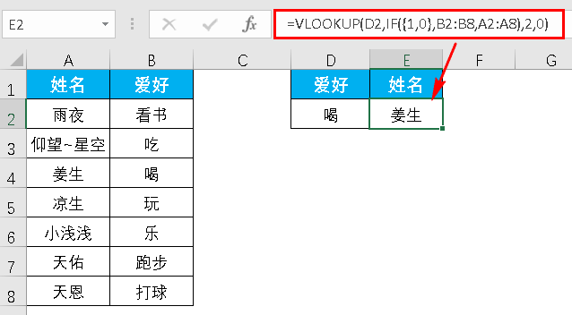 函数VLOOKUP借助IF{1,0}结构将两列顺序对换,逆向转换为顺序,从而实现逆向查找