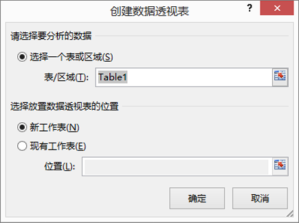 Excel 将显示“创建数据透视表”对话框,区域或表名称处于选中状态。