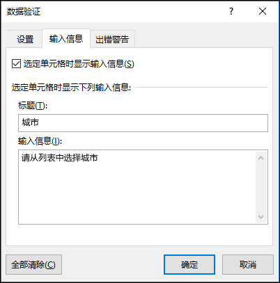 如果希望在单击单元格时弹出信息,请选中“选定单元格时显示输入信息”复选框,并在框中键入标题和信息(最多可键入 225 个字符)。 如果不希望显示信息,请清除该复选框。