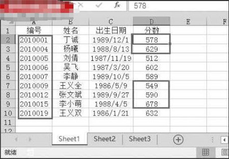 步骤2:将光标定位在“分数”列任意单元格中,在“数据”菜单“排序和筛选”选项组中单击“升序”按钮。可以看到整列数据按分数从低到高排列,最低分数为“512”,如图2所示。