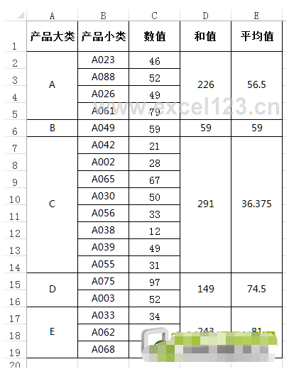如图所示的表格中,为了让数据更加醒目而用到了合并单元格,各合并单元格包含的行数不等,需要在D列和E列的合并单元格中计算每个“产品大类”对应“产品小类”的和值和平均值。在数据较多的情况下除了使用自定义函数的方法外,还可以用下面的公式。