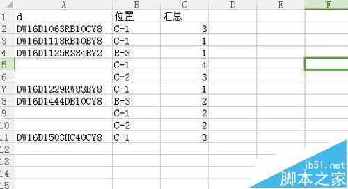 5、得到的数据透视表如图,显示的每个物料号(d)在每个位置的汇总,但是因为我们要进行后续工作,所以不能显示每个分类的汇总。