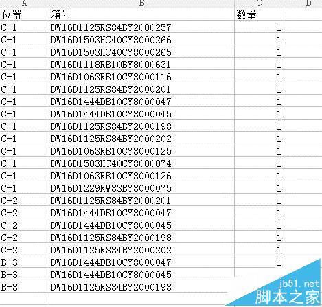 2、初始表格如图,一个位置有多个箱号,可能箱号不一样,依次是位置,箱号,数量,在第四格取值,输入=mid(箱号,1,16),得到物料号(d所在列)。