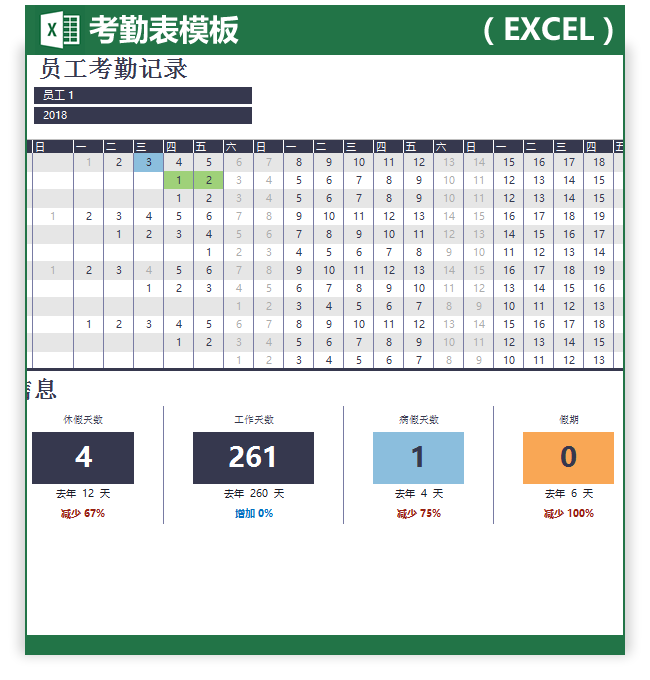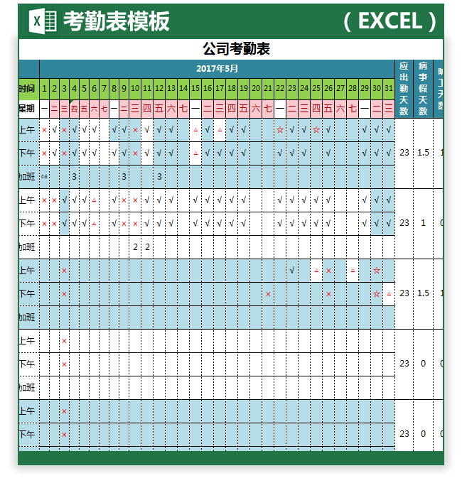 这也是一张需要手工输入的考勤表,萝卜和卷心菜,各有各的爱!出席情况;离开;事假;病假;出差;十、旷工;迟到了。早点离开;具有统计功能。