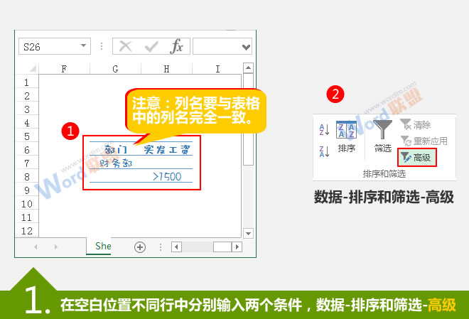 1.在工作表的空白位置写下两个条件。请注意,列名应该与原始表完全一致,并将这两个条件分别写在不同的行上。然后单击数据选项卡的排序和筛选组中的高级按钮。