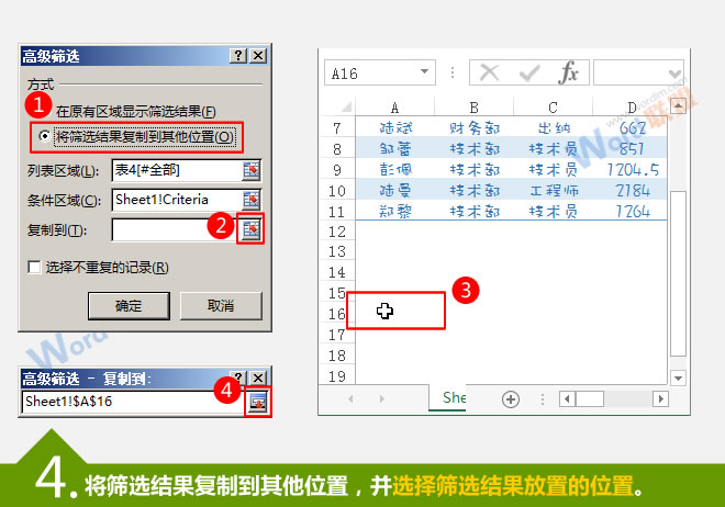 4.选择“将过滤结果复制到其他位置”,然后选择放置过滤结果的位置。