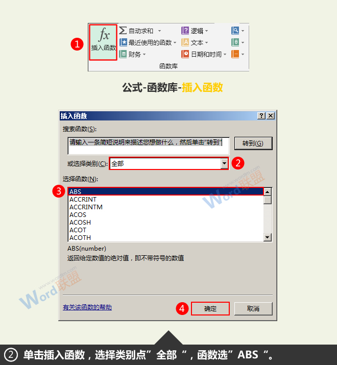 2.单击公式选项卡,然后单击函数库组中的插入函数。弹出“插入功能”对话框,将“或选择类别”设置为“全部”,从“选择功能”下拉列表中选择“防抱死制动系统”。