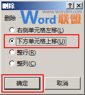 2、此时会弹出一个“删除”对话框,大家选择自己需要的删除单元格的属性,例如,我们现在选择“下方单元格上移”,也就是说,当我们删除了选中的单元格之后,它下方的单元格会集体上移,最后单击“确定”按钮。