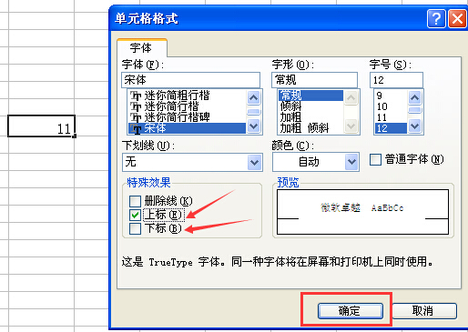 4、在弹出对话框,选择上标(或者下标)然后确定