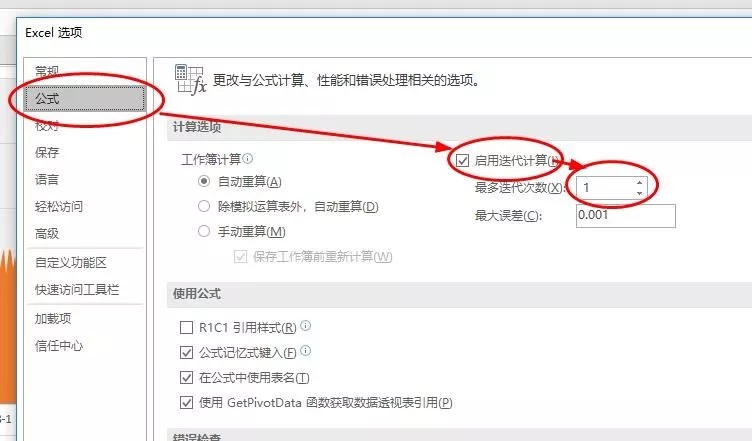 文件 – Excel选项 – 公式 – 选中“启用迭代计算” – 最多迭代次数输入数字1