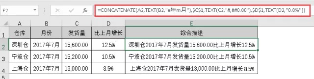 =CONCATENATE(A2,TEXT(B2,”e年m月”),$C$1,TEXT(C2,”#,##0.00″),$D$1,TEXT(D2,”0.0%”))