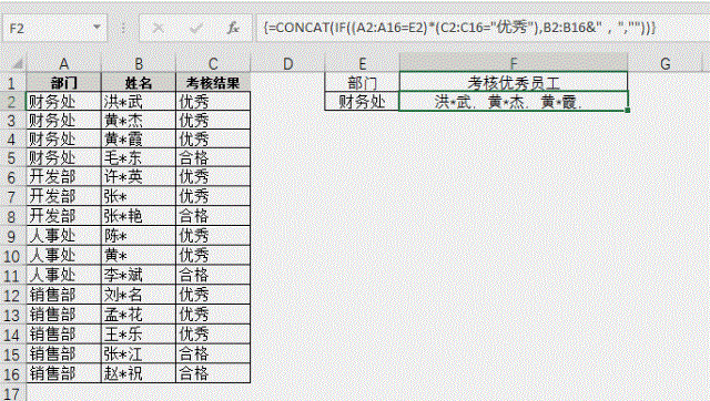 CONCAT函数还可以用于符合某些条件的数据合并,不如以下动图,筛选的是各个部门考核优秀的员工名单,而且,如果源数据有变化,结果也会跟着更新: