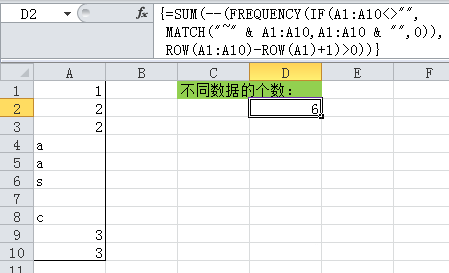 上面的例子中,统计的数值全部都是数字,如果单元格区域中除了数字外,还有文本呢?例如下图2所示的工作表,求单元格区域A1:A10中不同数值的个数。