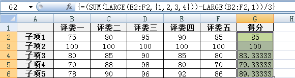 由于赶时间,我没多想,直接使用了一个数组公式。其思想是,取5个数值中前面第1、第2、第3和第4大的数字并求它们的和,减去第1大的数字后除以3即得到结果。