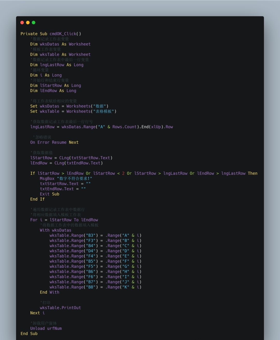 如果要打印指定的数据行,可以简单地使用Application对象的InputBox方法,用来让用户输入要打印的行号。代码如下: