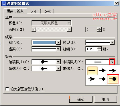 4.单击弹出对话框中的“颜色和线条”选项卡,然后单击“箭头”区域中“开始样式”后面的下拉按钮选择样式。边肖在这里选择了钻石风格,然后选择了结束风格。在这里,首先选择一个圆形样式,然后点击“确定”;