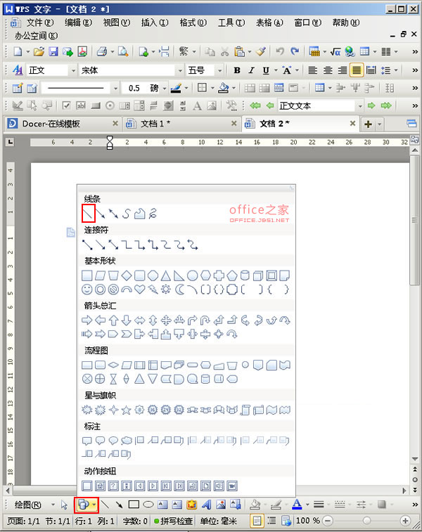 2.此时,绘图工具栏将出现在软件的底部。点击“自选图形”按钮,在弹出菜单中找到“线条”图形,点击;