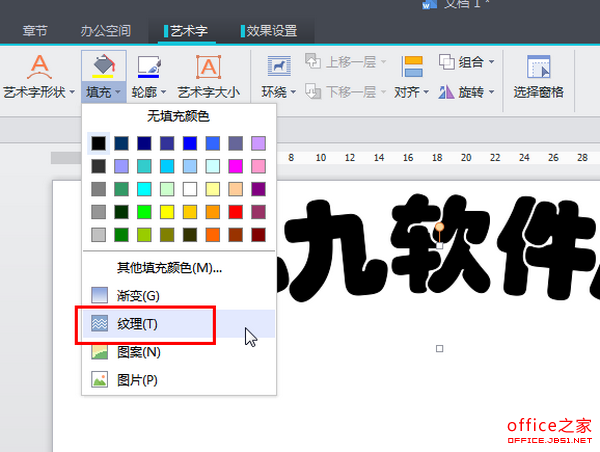 制作步骤3:文本,然后我们添加纹理效果到它,点击艺术字,我们看到在艺术字的菜单栏上有一个项目“填充”,我们点击它并选择纹理