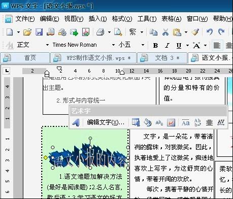 4.2标题首先插入文本框。如果它没有被分成列,而是打算被制作成一个横幅标题,它被安排在与主文本相同的文本框中,它可以直接用“插入-图片-艺术字”来设计。参见图9。但是,如果发布的文章需要分成几个栏,则应该单独拉一个文本框来放置标题。可以使用艺术字,也可以直接输入文本设置。参见图10和图11。