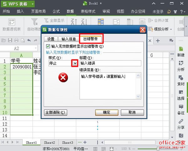 切换到“错误警告”标签,点击“样式”右侧的下拉三角形,在弹出的下拉列表中选择想要的方法,选择“停止”,然后在标题下方的对话框中输入“错误警告”,在“错误信息”下输入相应的相关文本,在此输入“学生编号不正确,请重新输入”,最后点击“确定”完成。