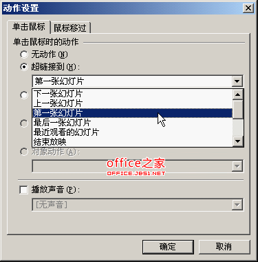 3、单击选中“封面”文本框,选择“幻灯片放映|动作设置”菜单项,打开动作设置对话框(图1),单击“超链接到”单选框中的“第一张幻灯片”,单击确定按钮。