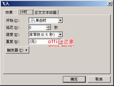 3、单击“动画列表”中“yòu”后边的下拉按钮,选择“效果选项”菜单项,打开“飞入”效果选项对话框,单击“计时”选项卡(图3);