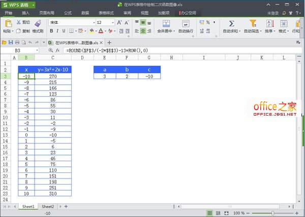 启动WPS表2013,首先设置abc的值,即二次函数的三个系数。