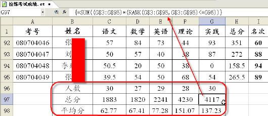 合格学生成绩总分的计算与学生人数的计算基本一致。只需在单元格C97中输入以下公式“=sum((c $ 3: c $ 95)*(rank(c $ 3: c $ 95,c $ 3:c $95)=c96)”,然后记住按下“Ctrl Shift Enter”快捷键即可获得相应的分数。