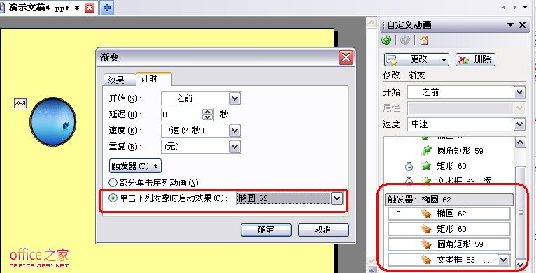 按住“Shift”键,分别选中任务窗格动画列表最上方和最下方的动画任务,将所有四个动画任务全部选中,然后点击右侧的下拉按钮,在弹出的菜单中点击“效果选项”命令,打开“效果选项”对话框。点击“计时”选项卡,点击下方“触发器”按钮,选中“单击下列对象时启动效果”单选项,并在右侧列表中选中原始的圆形按钮,如图5所示。