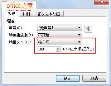 ⑦在效果选项卡中,将动画文本设为按字母,下面的延迟100,确定。