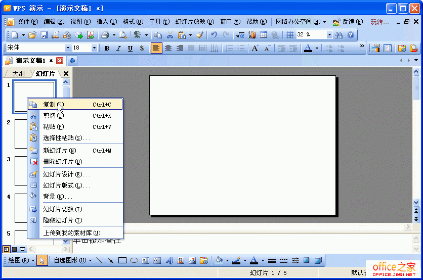 第4步:在幻灯片预览窗格中右击第1张幻灯片,选择“复制”,再多次右击,选择“粘贴”即可将空白幻灯片复制多张(比如5张)出来。