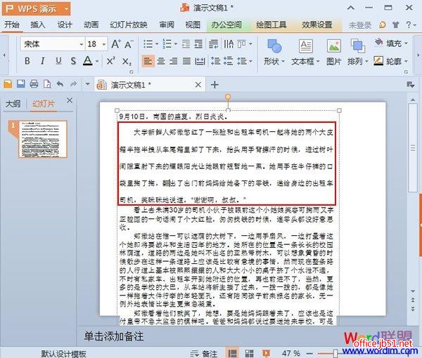 ①启动WPS演示2013,单击插入–文本框–横向文本框(在此菜单中还有一个竖向文本框)大家可以根据需要自由选择,本例只作演示使用。
