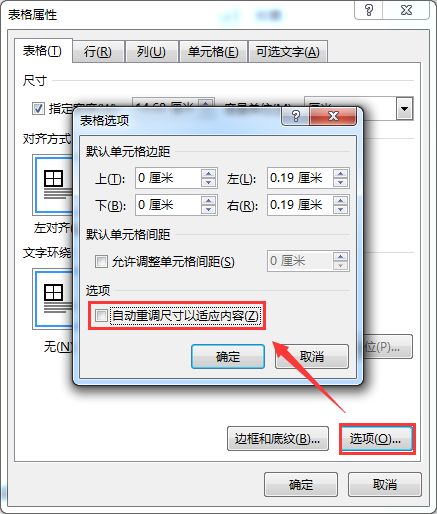 (3)打开“表格属性”对话框,点击“选项”按钮。将“默认单元格边距”均设置为0,然后取消勾选“自动重调尺寸以适应内容”复选框,依次单击“确定”按钮。