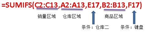 在G5单元格输入公式:“=SUMIFS(C2:C13,A2:A13,E5,B2:B13,F5)”