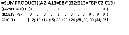 在G8单元格输入公式:“=SUMPRODUCT((A2:A13=E8)*(B2:B13=F8)*C2:C13)”其中,各个数组返回值: