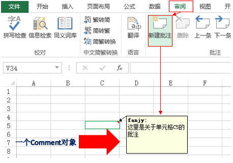 Comment对象代表单元格批注。如下所示,单击“审阅”选项卡中的“新建批注”命令,为单元格C5添加一条批注。这条批注就是一个Comment对象。