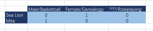 这次是3行2列数组,由6个元素组成。此时,相同向量类型的数组分别是第二个数组{“Sea lion”;”Mite”}和第三个数组{“Basketball”;”Genealogy”;”Roleplaying”},因此配对如下:”Sea lion”/” Basketball”、”Mite”/”Genealogy”、”???”/”Roleplaying”。